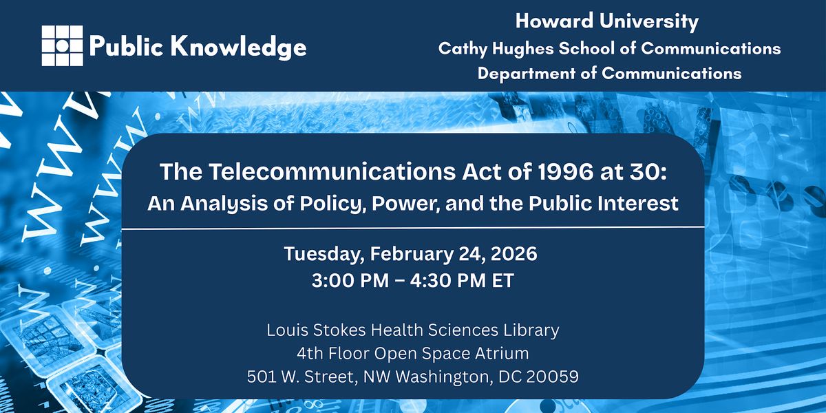 Join Public Knowledge and the Cathy Hughes School of Communications Department of Communications Studies at Howard University for a landmark discussion on the 30th anniversary of the Telecommunications Act of 1996. As a cornerstone of modern communication policy, this legislation continues to shape how we connect, create, and communicate in the digital age.