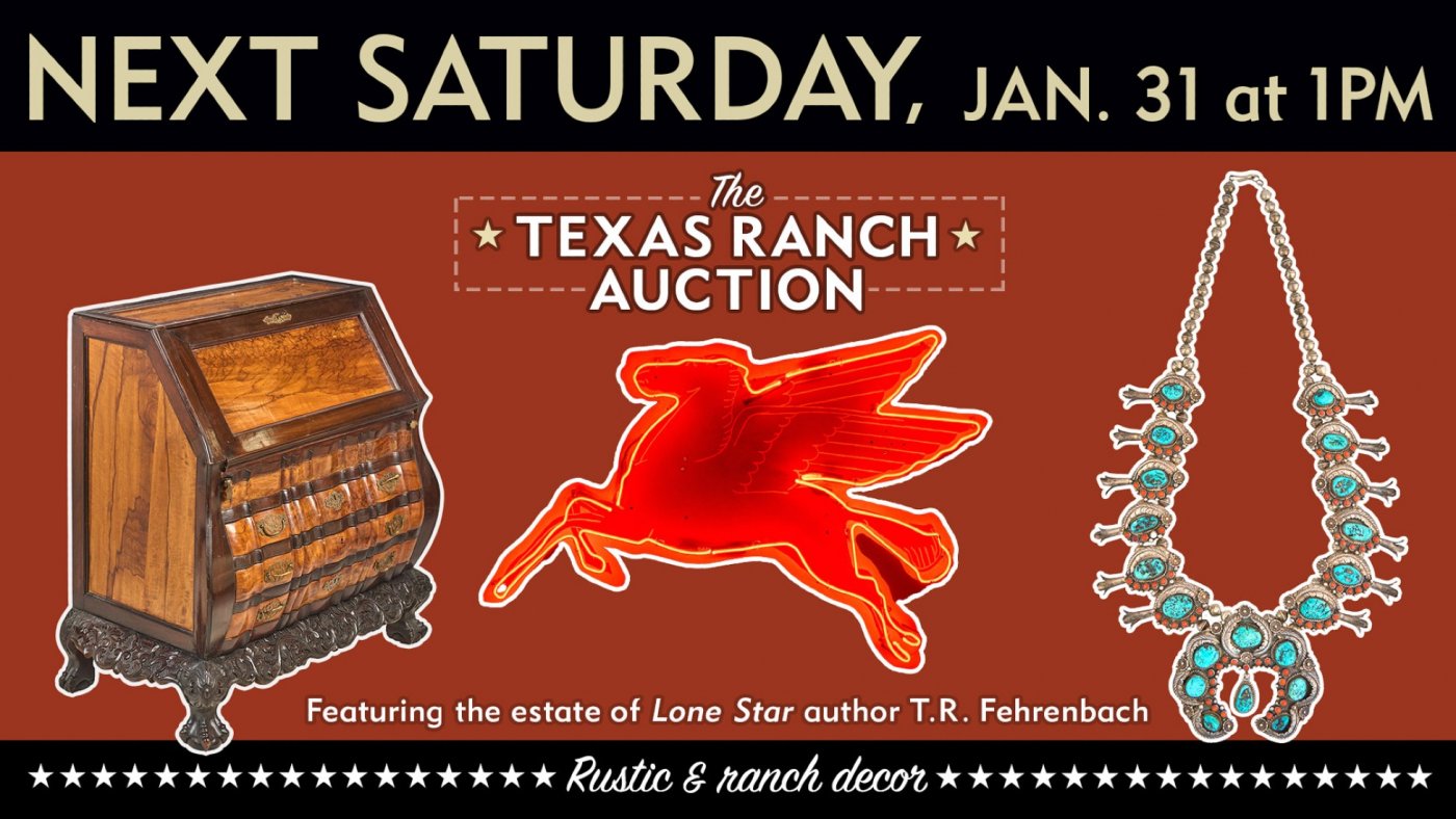 The Texas Ranch Auction returns in 2026 BIGGER than ever, featuring the personal Estate of noted Texas historian and author Theodore “T.R.” Fehrenbach, Jr. (1925-2013) including his personal signed copies of his works, his writing desk, typewriter and personal and military effects from his Alamo Heights home, also featuring an outstanding collection of Native American jewelry, original Western art, vintage advertising, ranch décor and artifacts - all capturing the spirit, history and character of the Lone Star State. Live + live online SATURDAY, JAN. 31 at 1PM!