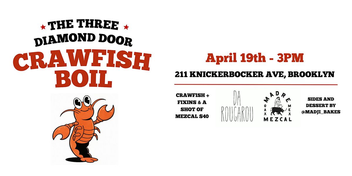 Sunday April 19th, come on down to The Three Diamond Door for a crawfish boil with our friends Da Rougarou! $40 gets you 3 lbs. of crawfish + fixins', plus a shot of Madre mezcal. Get your ticket in advance to secure the (boil) bag!