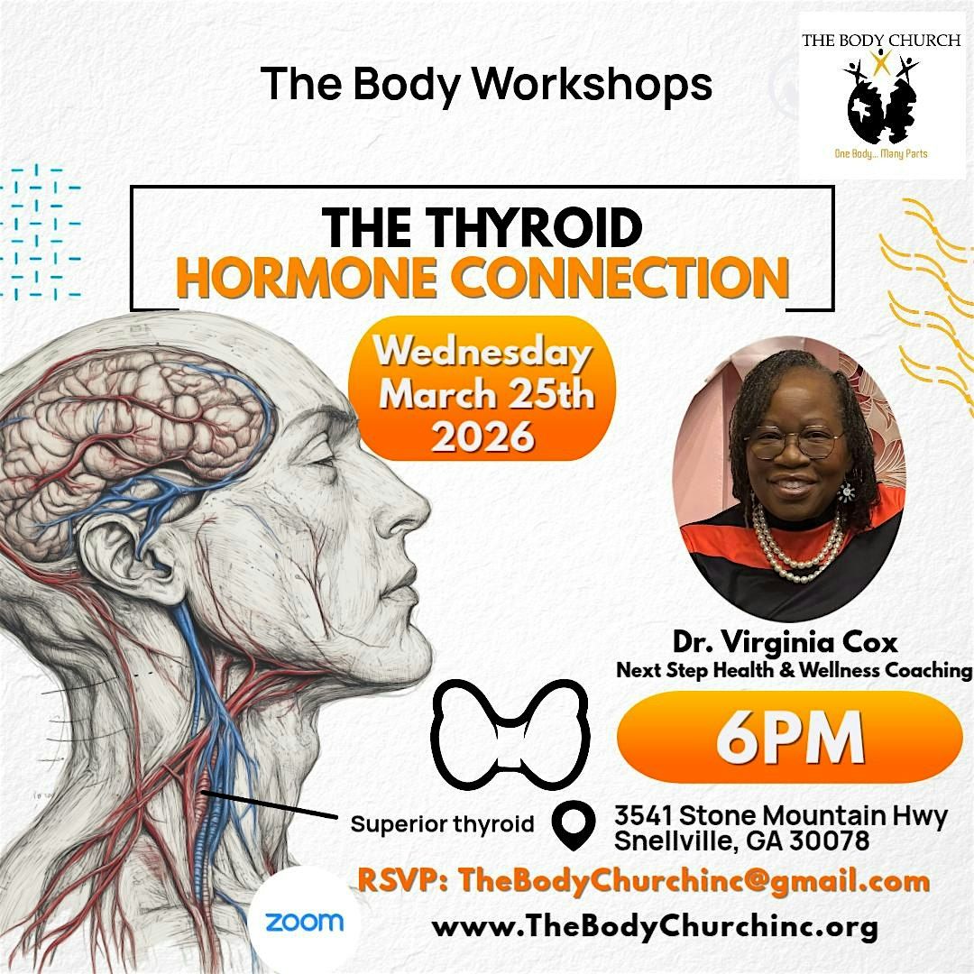Join us at The Body Church on March 25, 2026 at 6:00 PM (Eastern Time) for a fun and relaxed workshop all about how your thyroid and hormones work together facilitated by Dr. Virginia Cox of Next Step Health and Wellness Coaching. Whether you're curious or looking to learn tips to feel better, this event is for you. Come hang out, ask questions, and discover new ways to boost your health in a friendly setting. Don’t miss out!
