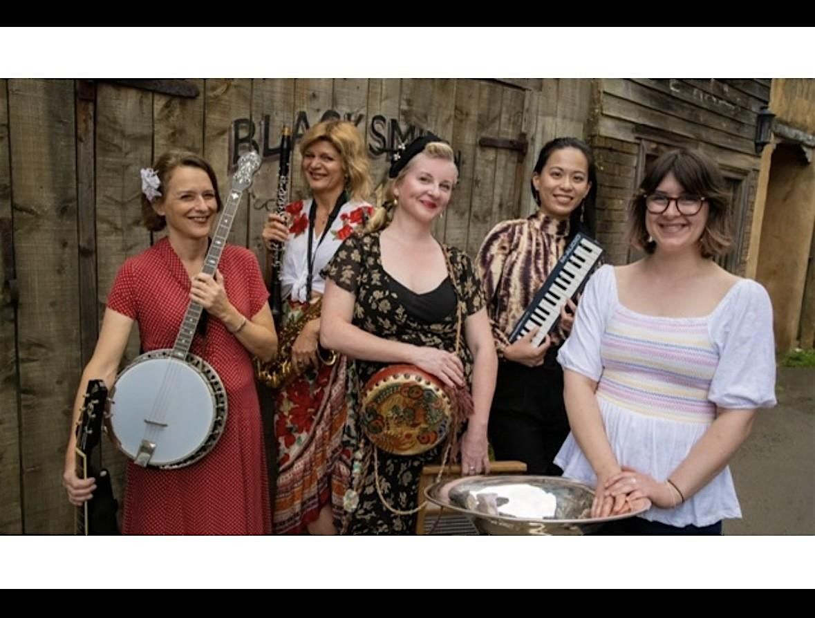 The Traveling Janes are a collective of women who perform vibrant vintage jazz and old time blues, with a distinctive twist in that they also add uplifting folk songs (1850s–1933) from Ireland and the British Isles. The January 2026 lineup brings together artists from California, France, Texas, Singapore and Scotland : Katie Cavera - banjo / guitar , Lauryn Gould - reeds, Ophélie Luminati drums , Ali Affleck - vocals , Amanda Lee - piano and Danielle Price on tuba .