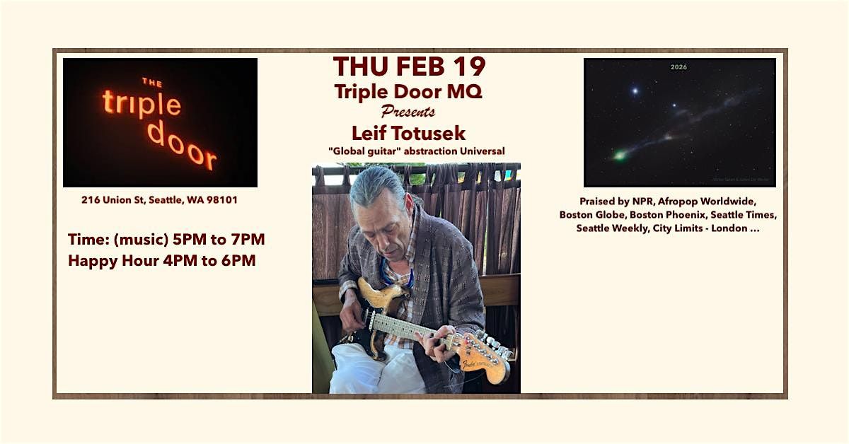 THU FEB 19, The Triple Door MQ Presents ... Leif Totusek "Global guitar" abstraction Universal ... Join us at The Triple Door MQ for a night of mesmerizingl guitar music with the talented Leif Totusek!Praised by NPR, Afropop Worldwide, Boston Globe, Boston Phoenix, Seattle Times, Seattle Weekly, City Limits - London ...Location: 216 Union St, Seattle, WA 98101
