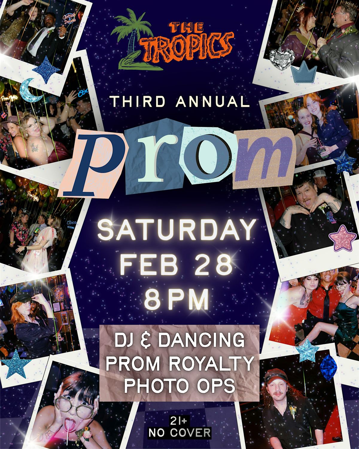 Prom night is back at The Tropics!We’re throwing our 3rd Annual Prom on Saturday, Feb 28 at 8PM. Dress up, grab a drink, and take over the