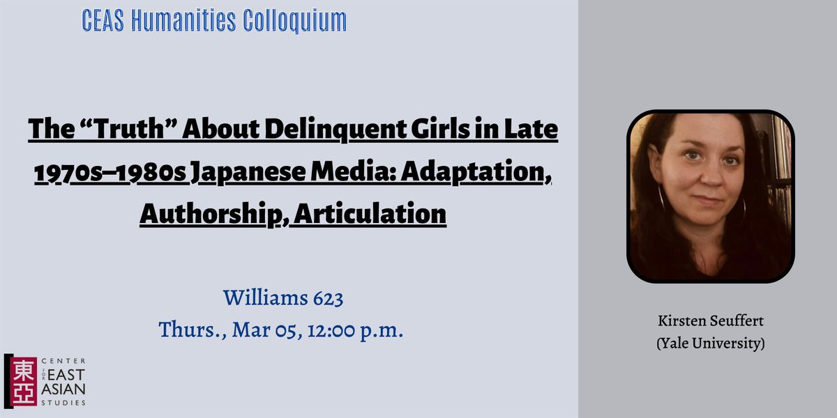 In a later 1970s–1980s Japanese mediasphere awash with idol images, “bad girls” and their media representations also carved out a prominent space within the cultural imagination. This talk explores a late 1970s–1980s boom in juvenile delinquent (furyō, hikō, or tsuppari) media content in Japan, focusing on furyō shōjo (delinquent girl) films and visual culture. In this moment, an explosion of furyō shōjo content crossed genre lines and populated such diverse media as film, television, manga, photography, and literature. As complex mixtures of the cool, the titillating, and the melodramatic, these images, performances, and stories capitalized on current cultural and subcultural trends. Yet they also reflected contemporary social concerns surrounding femininity and youth, illuminating gendered and patriarchal attitudes toward and prurient interest in bad girls and their behavior—an enduring visual and narrative trope in the Japanese context and beyond. Stressing the social and historical significance of attempting to write one’s own body—while acknowledging its ambiguities—Seuffert locates a counterarchive of media content produced by self-identified furyō girls and women that renegotiates control over such limiting narratives and images. This diverse body of materials demonstrates that in 1970s–1980s Japan, there were many ways a girl could go “off the rails”—or be labeled as such—and just as many media and modes via which furyō experiences could be and were expressed.