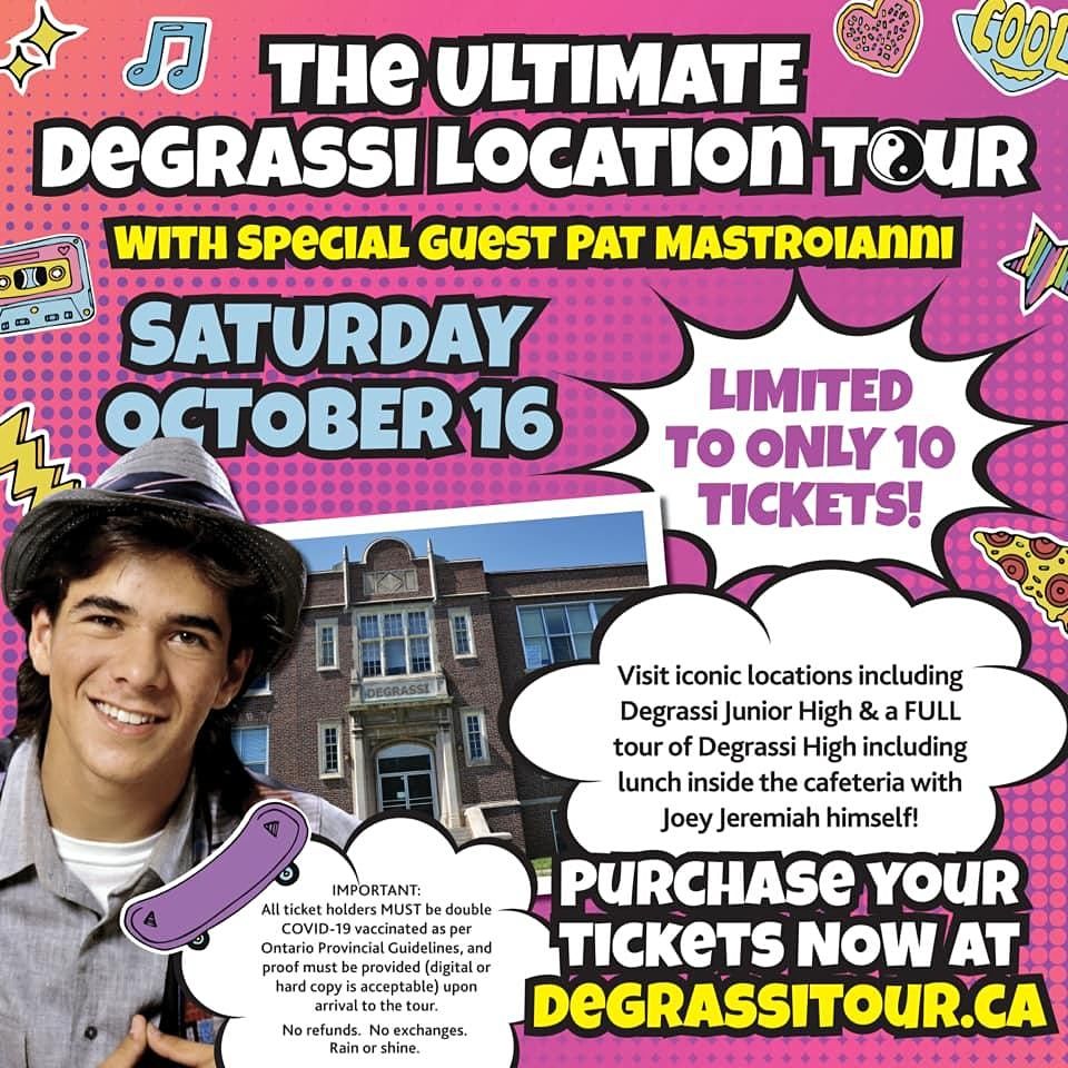 Visit iconic locations in a private tour van including Degrassi Junior High & Degrassi High, the former production office and Kit Hood Memorial Laneway, as well as De Grassi Street, ALL with Joey Jeremiah himself, Pat Mastroianni!