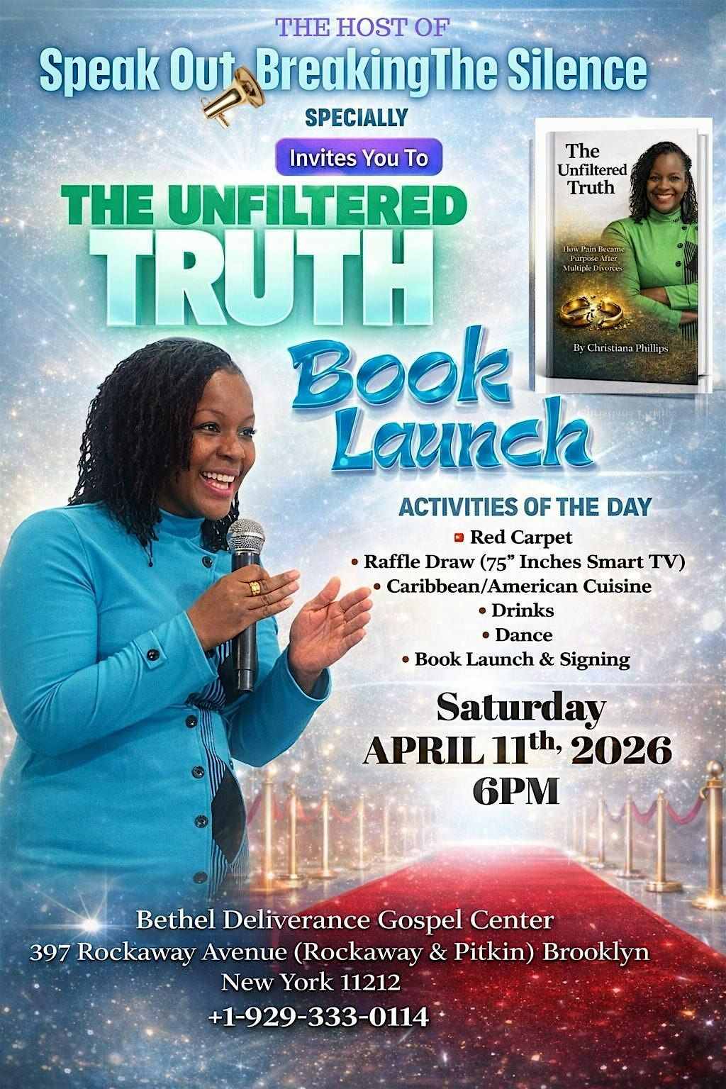 ACTIVITIES OF THE DAY: Red Carpet 6pm! Raffle draw (75" inches Smart TV, Caribbean/American Cuisine, drinks, dance and of course book signing....DON'T FORGET TO GET YOUR RAFFLE TICKETS TODAYYYYY $25 each, $20 for 2 plus. Contact us at 929-333-0114 for your raffle tickets or any further information.
