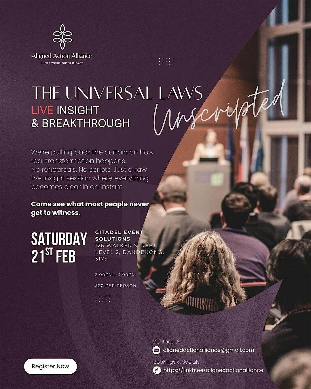 The Universal Laws: Unscripted is a one-hour, live audience experience hosted by Aligned Action Alliance, offering a real, unscripted look into energetic alignment work as it unfolds in real time.