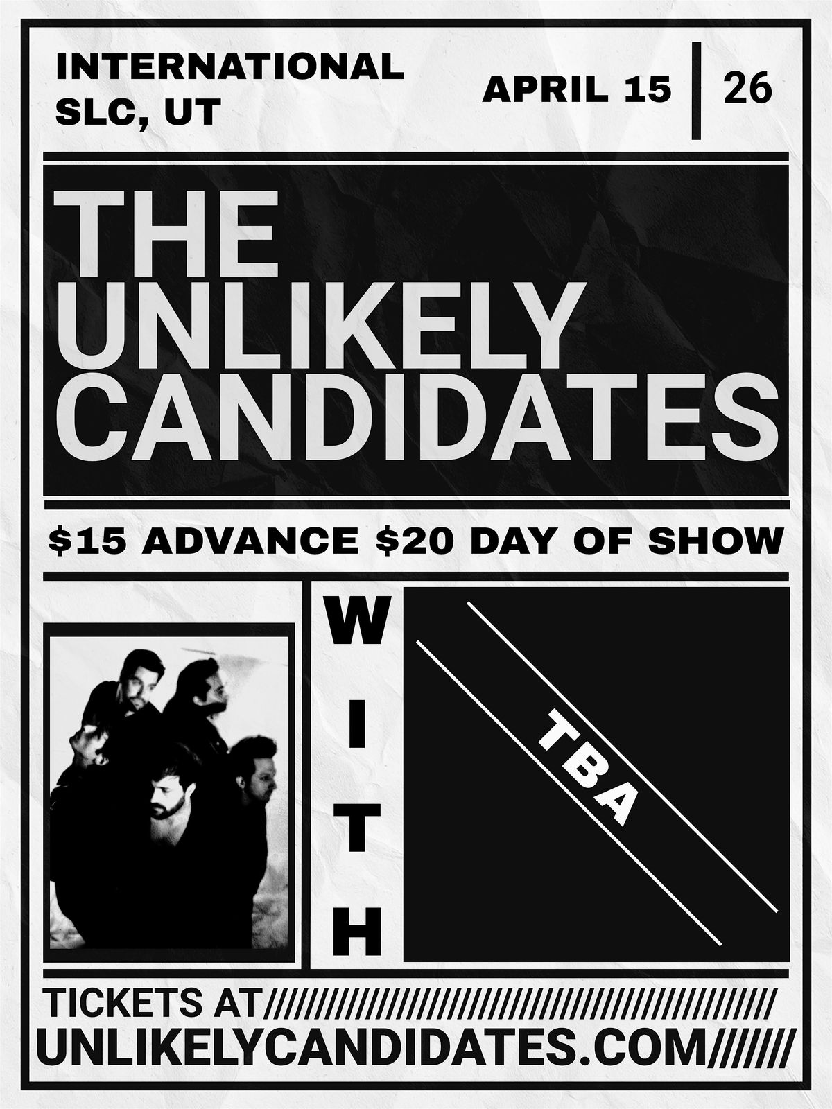 On April 15th come check out The Unlikely Candidates live at International. Local support to be announced soon. $15 advance $20 day of showAbout this Event