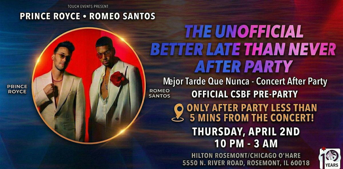 Heading to see Romeo Santos & Prince Royce on the Mejor Tarde Que Nunca Tour? Come keep the vibe alive at the Unofficial After Party at the Hilton Rosemont / Chicago O’Hare—the closest and most convenient party after the show.