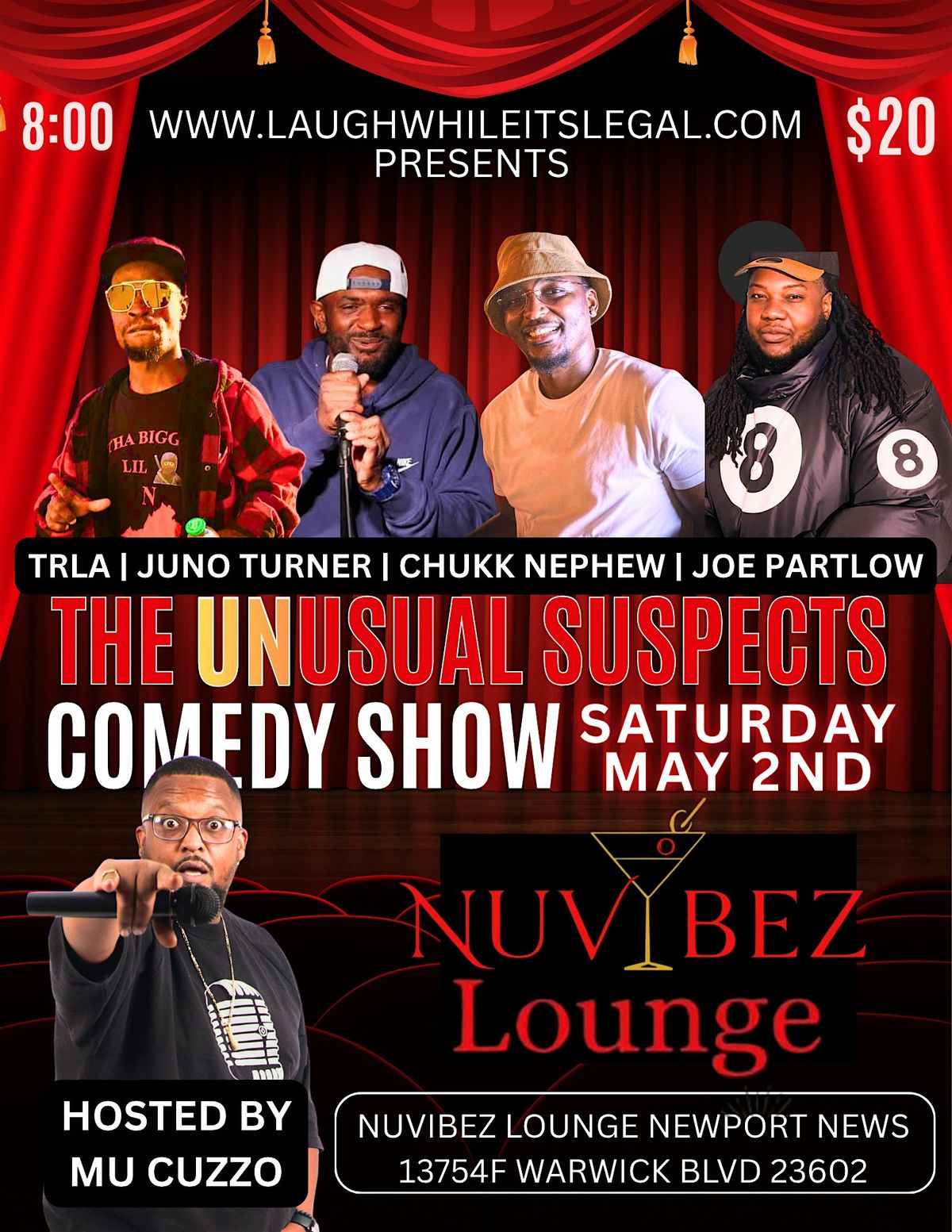 Get ready for a night of laughs with The Unusual Suspects Comedy Show! Join us in person for a hilarious lineup that'll have you rolling in the aisles. It's all about good vibes, unexpected jokes, and nonstop fun. Don't miss out on this comedy adventure— Don't forget NuVibez has some of the best cuisine on the coast so bring your friends and let's make some memories!
