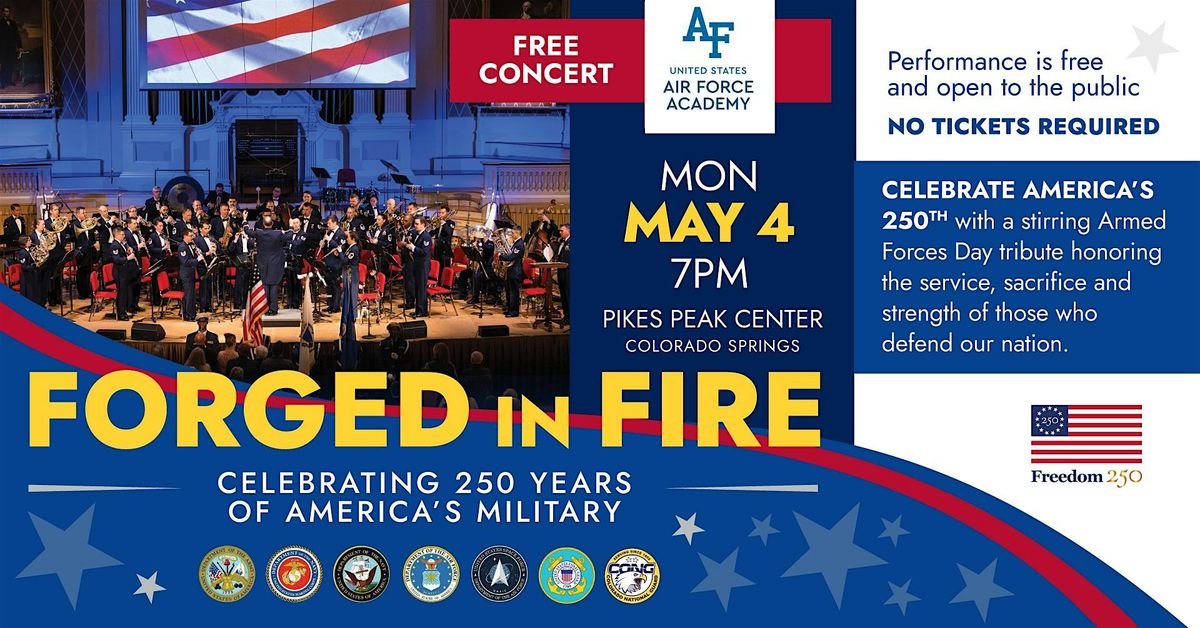 The U.S. Air Force Academy Band will present "Forged in Fire" - Armed Forces Day 2026, a FREE concert held at the Pikes Peak Center on May 4th at 7pm.