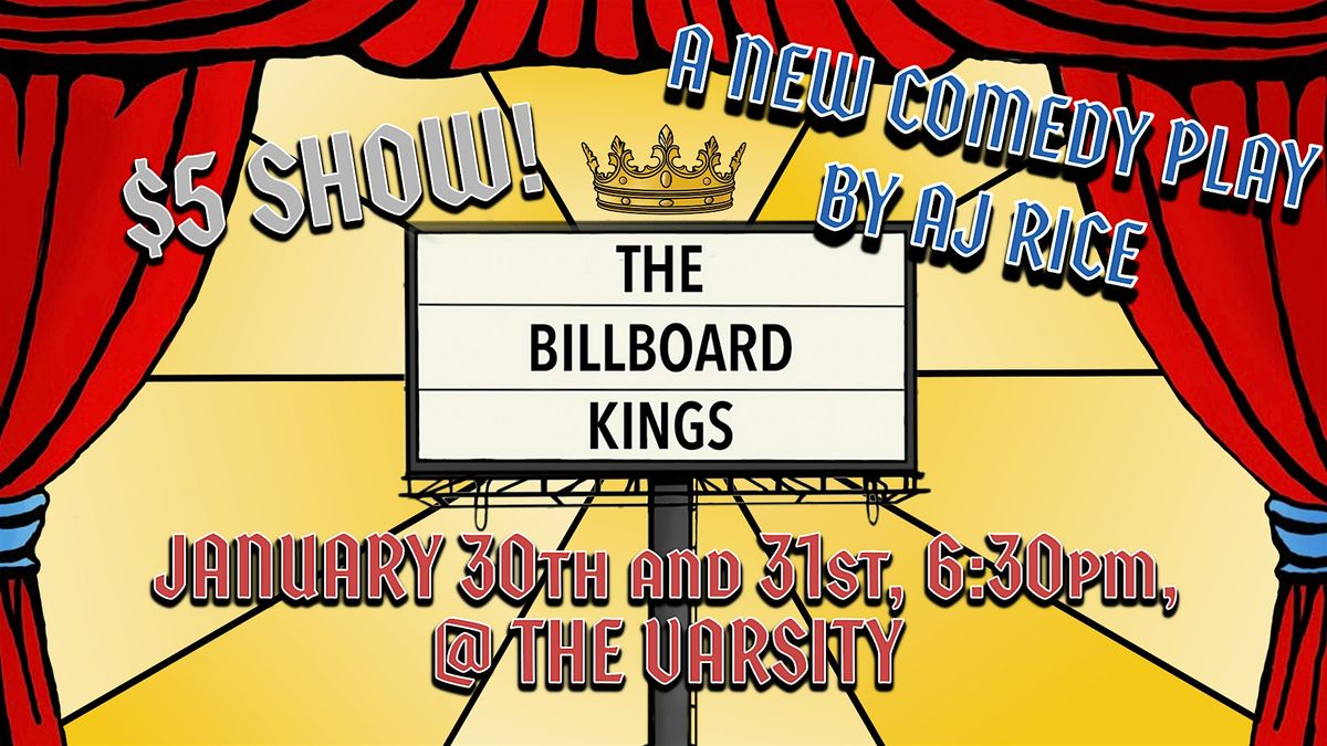 The Billboard Kings is a fast-paced comedic play with lots of audience interaction! The world's greatest Billboard Mogul comes face-to-face with a small business owner in an epic clash of action, comedy, and billboards! Come if you want an hour of laughs, stomach-wrenching drama, and a deep meditative thoughts! Only January 30th and 31st, 6:30pm, at The Varsity! Doors open an hour prior.
