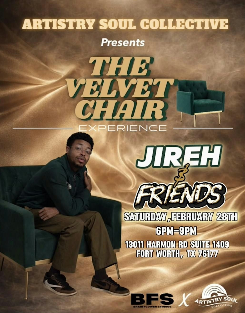 Come join us for a night of pure magic at The Velvet Chair Experience! Get ready to be blown away by local artist, Jireh Campbell and his phenomenal surprise guests! This event guarantees an unforgettable experience that will leave you wanting more. Don't miss out on this unique opportunity to immerse yourself in a world of creativity and inspiration. Mark your calendars and get ready to be amazed!
