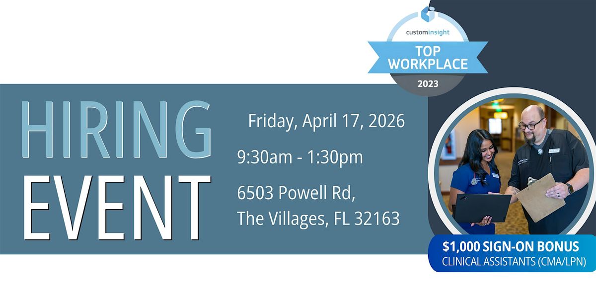 Thank you for your interest in joining The Villages Health team! Please check our careers page (www.thevillageshealth.com/careers) regularly for the most up-to-date list of current openings, as positions may be filled before our hiring event.