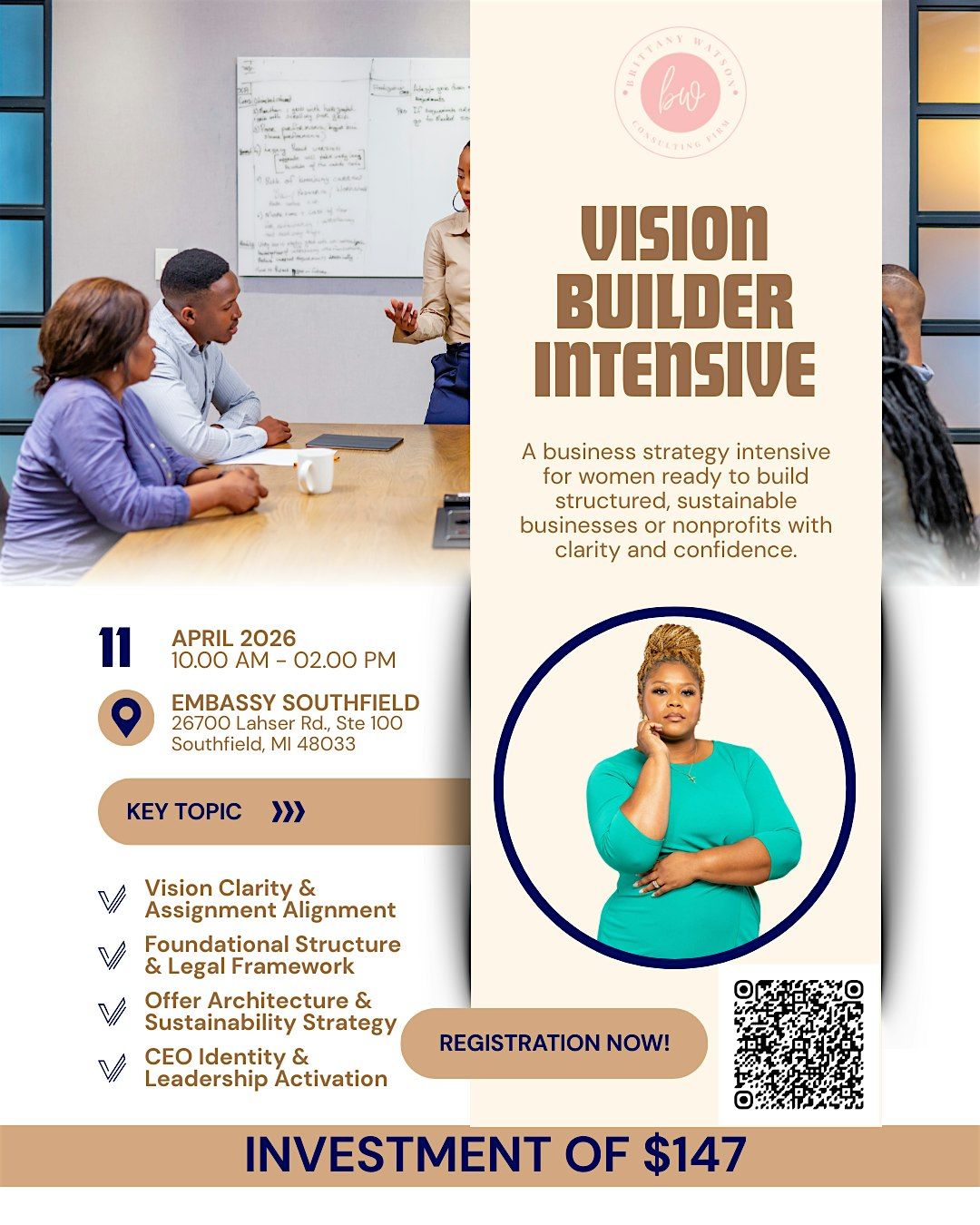 Led by Brittany N. Watson, Founder & Leadership Development Architect, this intimate intensive equips visionary women with the foundational tools required to transform ideas into sustainable businesses or impact-driven organizations.