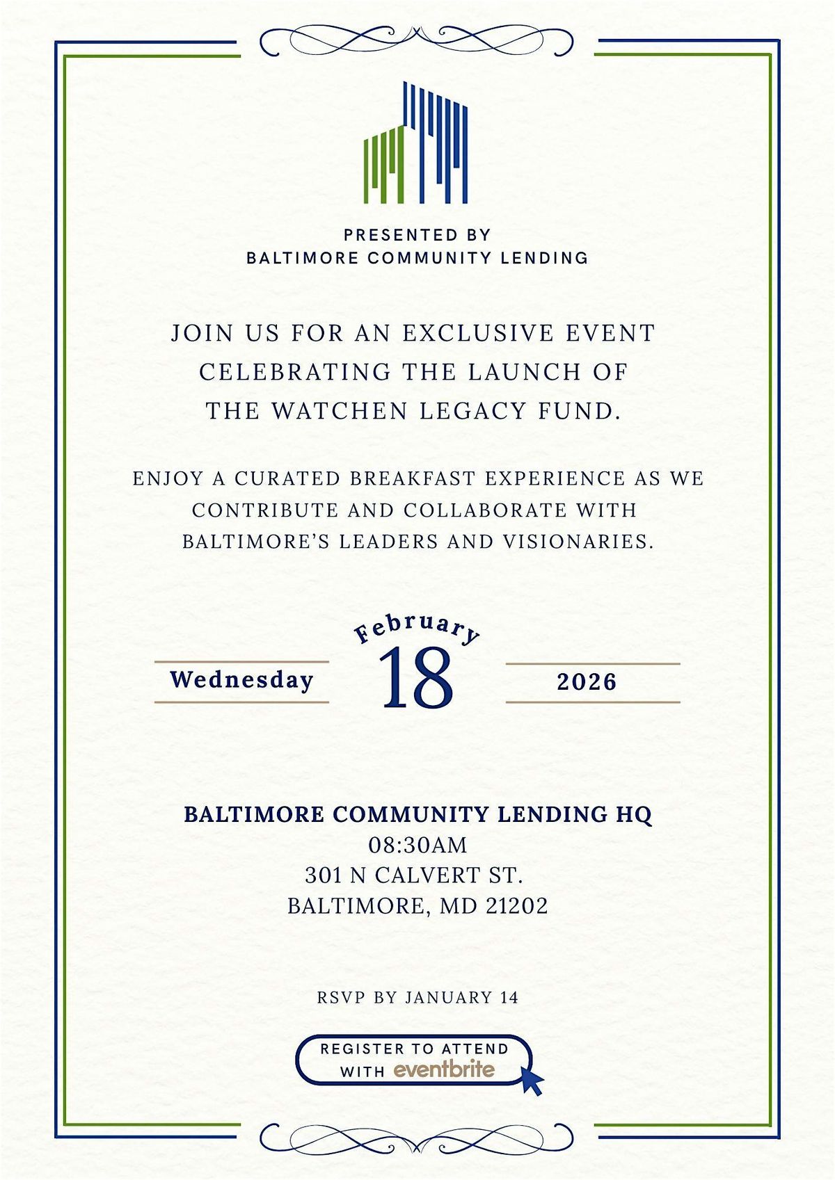 Baltimore Community Lending invites you to an exclusive breakfast experience marking the official launch of the Watchen Legacy Fund, a visionary initiative honoring the leadership and impact of President & CEO Watchen Harris Bruce as she prepares for retirement in 2026.