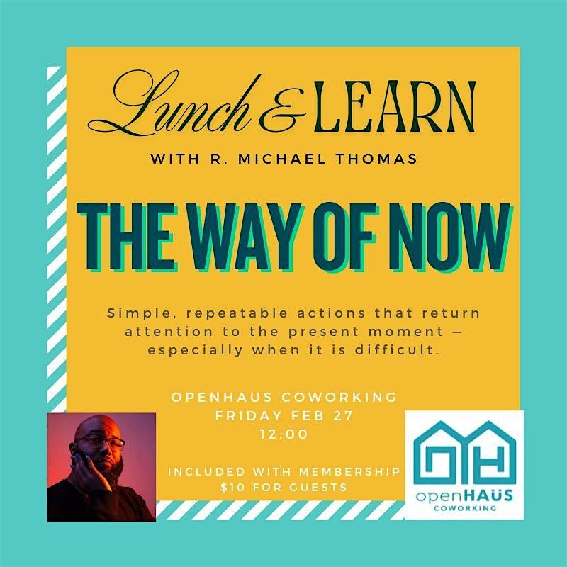 It's back! openHAUS coworking's monthly lunch and learn series and we are delighted to kick it off with R. Michael Thomas sharing his workbook and philosophy, The Way of Now. Speghetti lunch will be served or bring your own. This series is offered free for members and we ask for a $10 donation for guests. Feel free to bring your work and cowork with us after lunch.