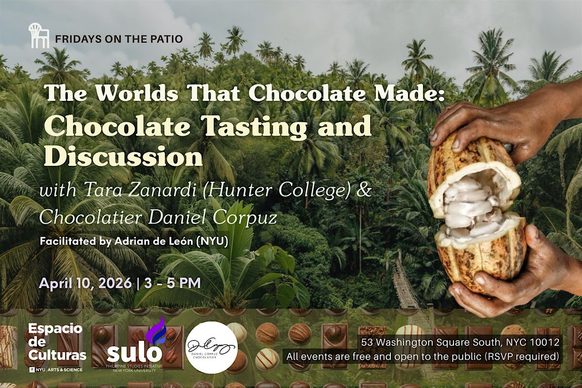 On select Fridays throughout the semester, we offer programs that are hands-on and interactive under the title of “Fridays on the Patio.” These programs are free and open to the public with registration. This event is in collaboration with SULO: The Philippine Studies Initiative at NYU, and includes a guided chocolate tasting, where you will be able to try chocolate crafted by Daniel Corpuz, a Filipino chocolatier based in New York City. The event will also feature a conversation with Tara Zanardi, a professor at Hunter College, who will explore the history and geopolitics of chocolate as they relate to the Americas and Philippines. The conversation will be facilitated by Adrian de León. Join us to appreciate the flavors of chocolate while also gaining insight into the systems that shape its production and accessibility— discovering the worlds that chocolate created.