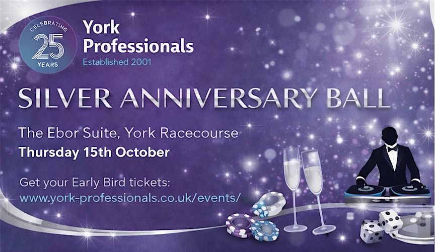 Join us to celebrate 25 years of representing the professional services sector in York at The York Professionals Silver Anniversary Ball on Thursday 15th October 2026 in the Ebor Suite at York Racecourse.