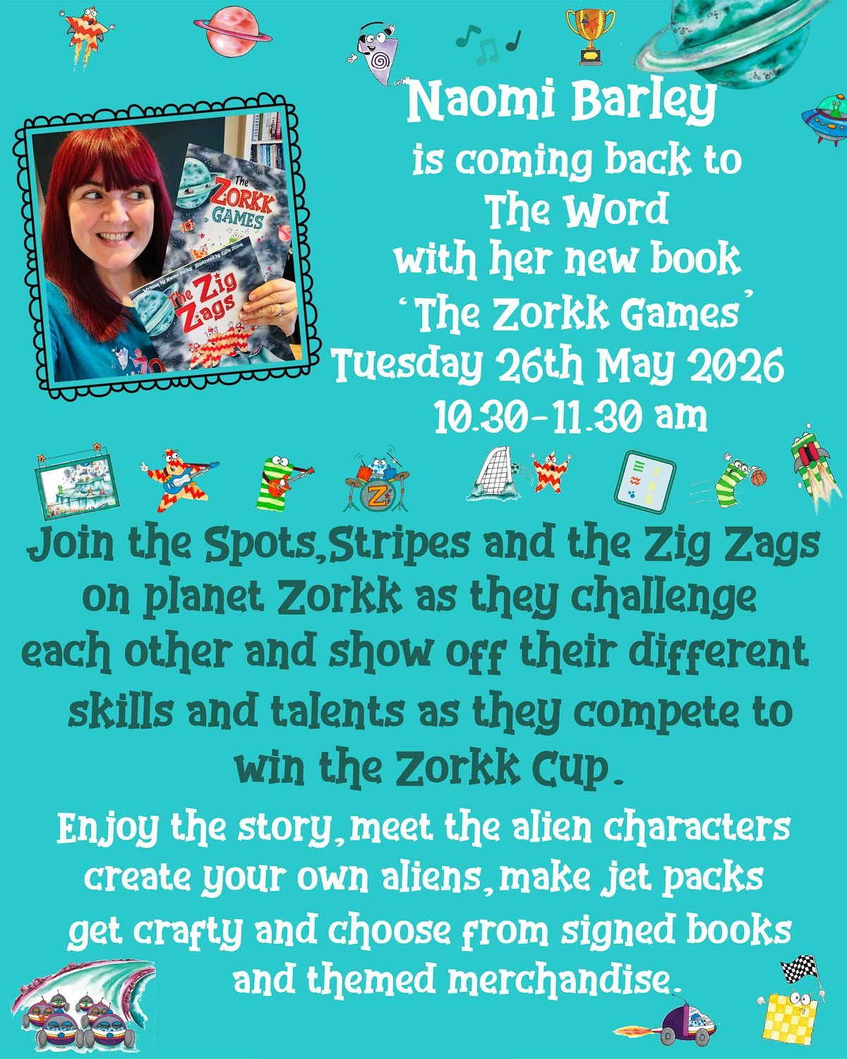 Naomi Barley is coming back to The Word with her new book 'The Zorkk Games'. Join the Spots, Stripes and the Zig Zags on planet Zorkk as they challenge each other and show off their different skills and talents as they compete to win the Zorkk cup!