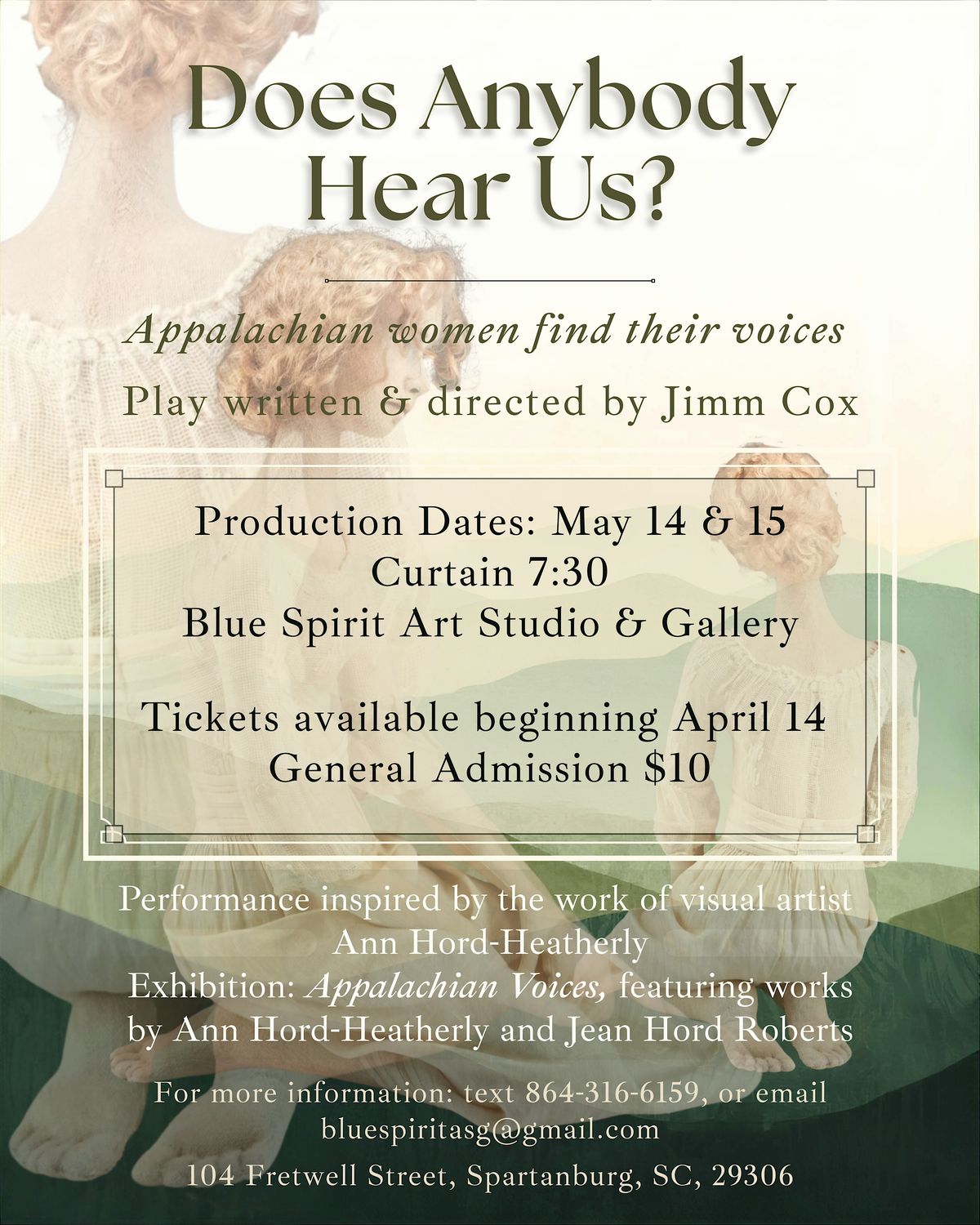Join us at the Blue Spirit Art Studio & Gallery May 14 & 15 at 7:00 pm for an unforgettable performance that celebrates the voices of Appalachian women. The performance was born from the playwright’s encounter of figurative art in exhibition. Consultation between artist and playwright gave rise to a series of stories motivated by the art pieces. The gallery owner and studio artist serving as producer of the piece agreed to host the performance and the figurative art in exhibition. The painter was introduced to the project as their work paralleled the exhibition thematically. The composer and lyricist was engaged by the playwright to produce an original theme to accompany the entire project.
