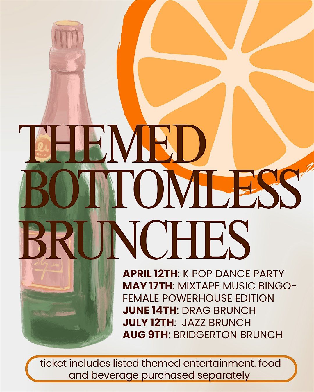 Alchemy loves to brunch and who doesnt love a good theme?! Join us one Sunday month April-August for a fun spin on brunch. Ticket includes the listed entertainment below. Food and drink available for purchase seperately. Come to just eat, come to drink bottomless mimosas, or just come for the fun!