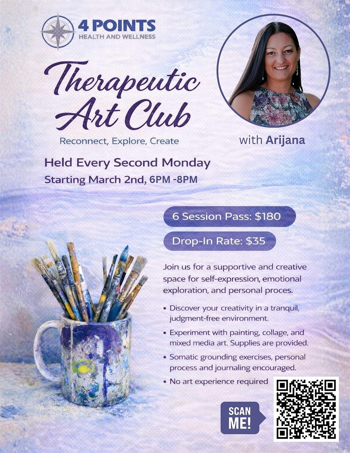 The Therapeutic Art Club is a supportive space for creative self-expression, personal exploration, and community connection. Held twice a month, this two-hour event invites you to reconnect with yourself through the process of making art while sharing space with others who value creativity, growth, and emotional well-being.