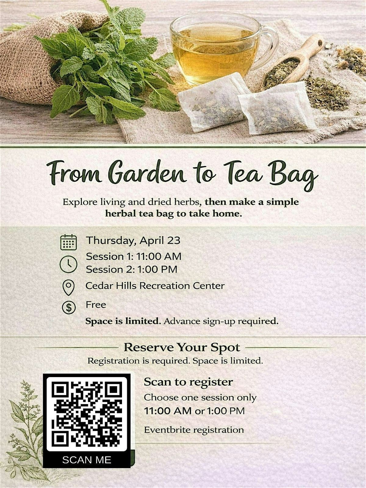Join us for a small-group therapeutic horticulture activity at Cedar Hills Recreation Center. Participants will explore living and dried herbs, including lemon balm and coneflower, through touch, scent, and observation, then create simple herbal tea bags to take home.