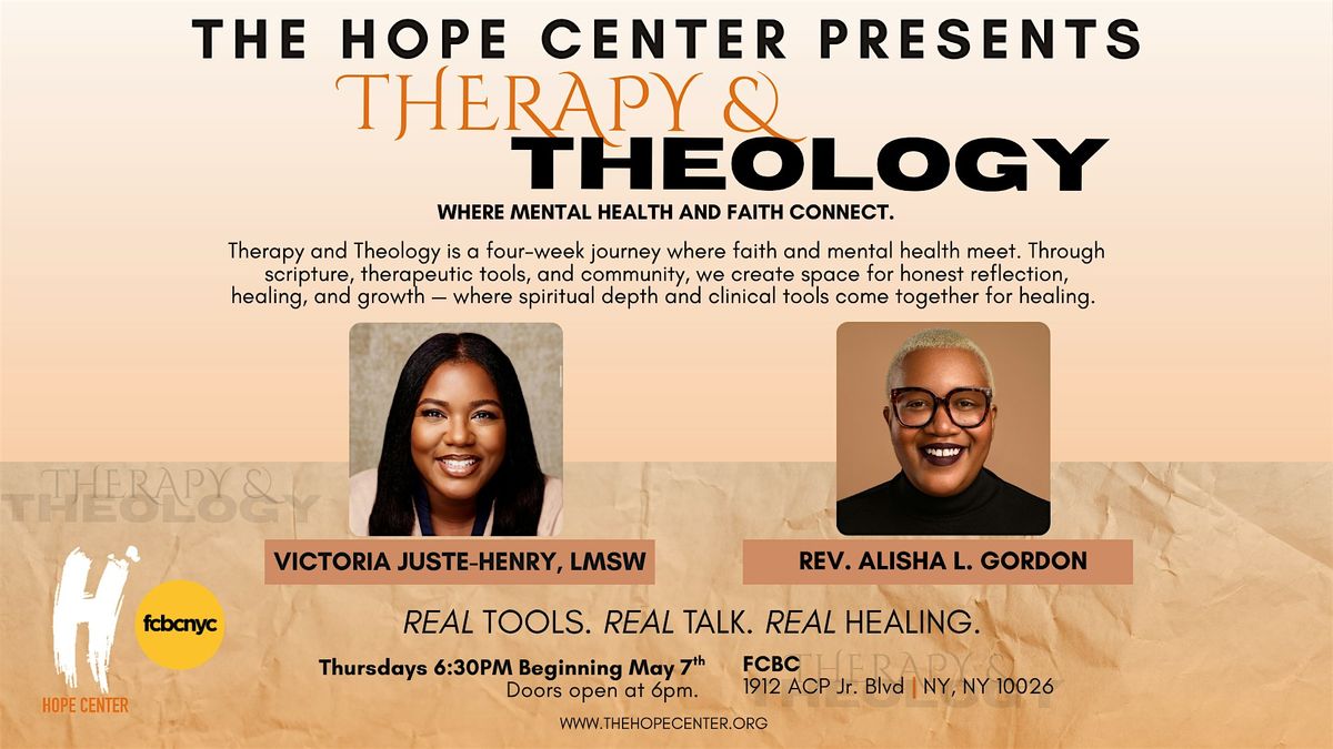 The HOPE Center, in partnership with FCBC, presents Therapy & Theology -a four-week journey where faith & mental health meet. Through scripture, therapeutic tools, & community, we create space for honest reflection, healing, & growth. This series will meet at 6:30pm on Thursdays beginning May 7th. Registration is required. Real tools. Real talk. Real healing.