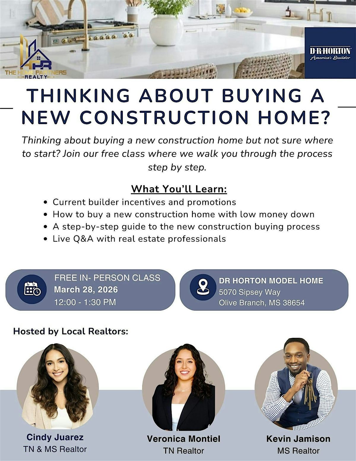During this session, local real estate professionals will explain what to expect when purchasing a newly built home, including how the process works with builders like DR Horton, what financing options are available, and how to prepare for the journey from contract to closing.