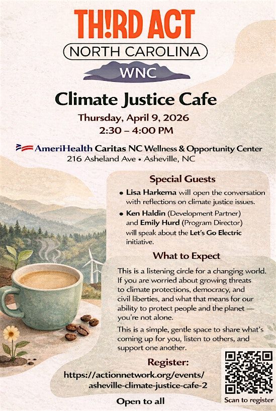 Join Third Act WNC for CLIMATE JUSTICE CAFE at AmeriHealth Caritas Wellness & Opportunity Center.
