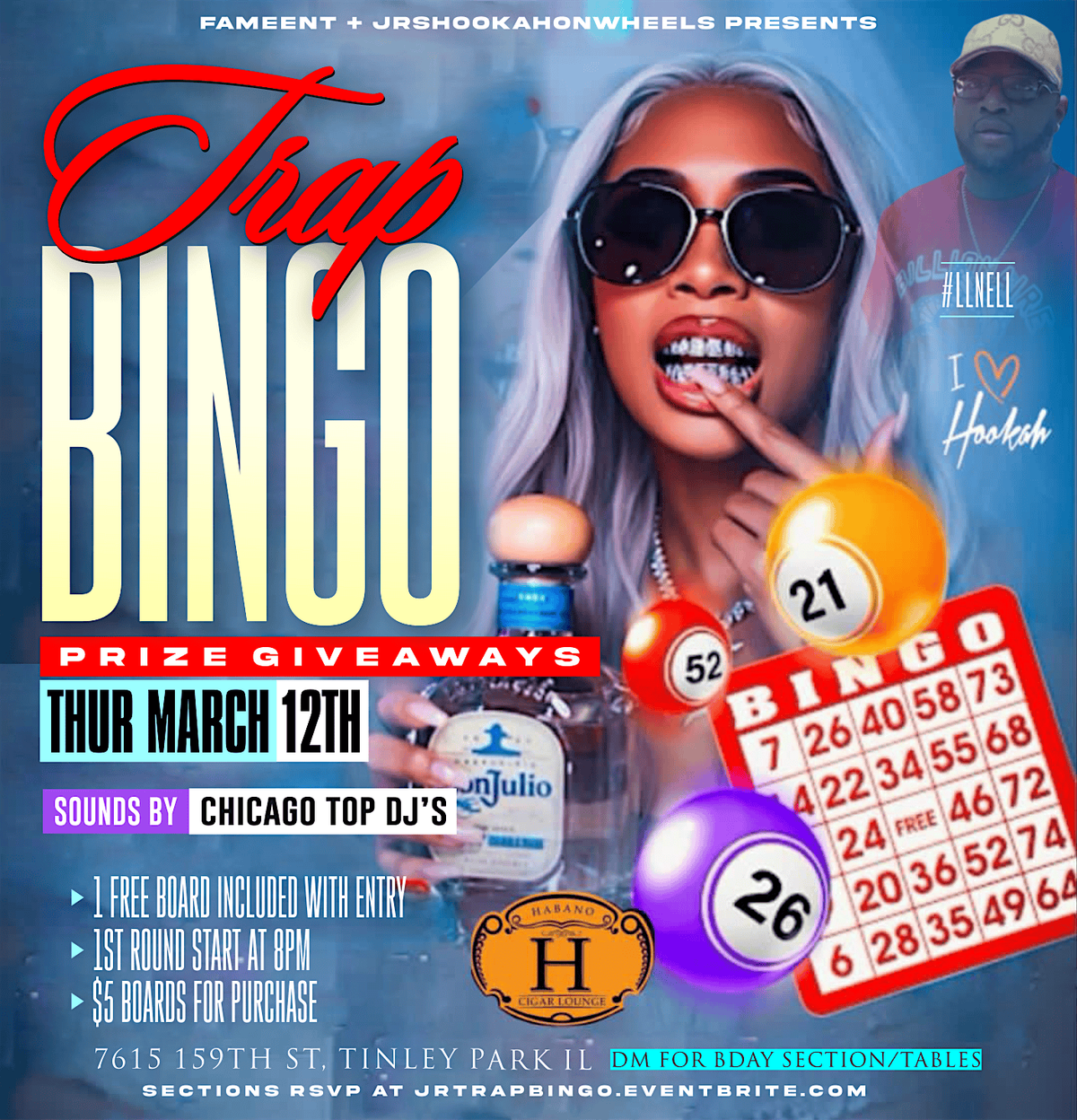 Ever been to a TRAP BINGO party!? Our DJ will play the hottest music while attendees match songs to Bingo cards! Yell "BINGO" & win prizeā¼About this Event