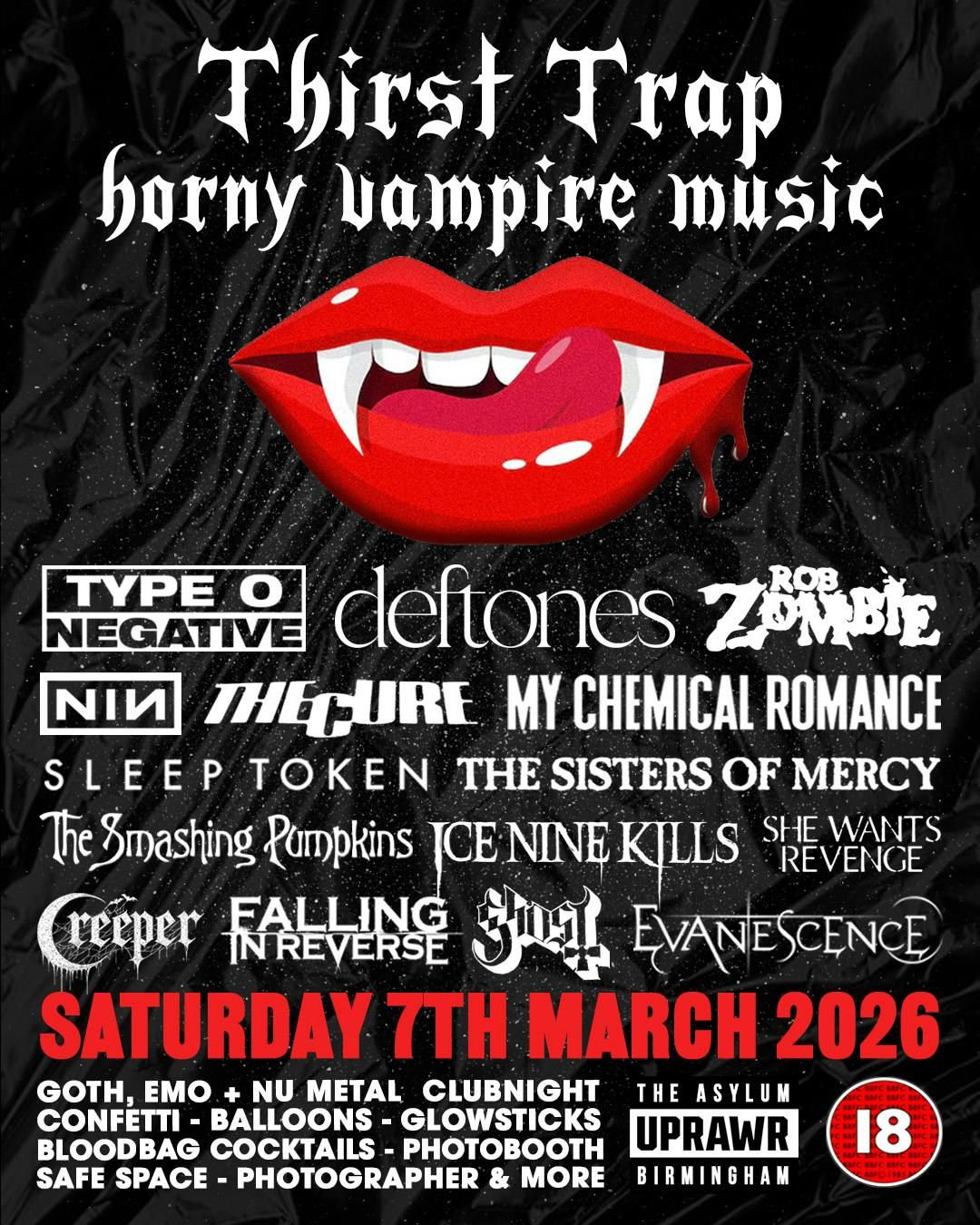 Horny Vampire Music, Chapter I: Calling all goths, emos, nu metal & industrial metal fans and baddies. On the 7th March we are bringing our first ever night dedicated entirely to the horniest vampire music of all time. Imagine if Nosferatu, Morticia Addams, The Crow and Elvira had a Spotify jam going - you get the picture... Expect to hear: Type O Negative - The Cure - The Smiths - The Sisters of Mercy - Rob Zombie - Nine Inch Nails - Korn - System of a Down - Tool - Rammstein - Alice In Chains - Deftones - Slipknot - Loathe - Sleep Token - Bad Omens - Spiritbox - Poppy - Falling In Reverse - Motionless in White - Ice Nine Kills - Black Veil Brides - My Chemical Romance - Pierce the Veil - Sleeping with Sirens - She Wants Revenge - The Smashing Pumkins - Hole - Evanescence - Linkin Park - Flyleaf - Creeper - Ghost - Artemas - Drab Majesty - Siouxsie and the Banshees - Depeche Mode - Joy Division - Ozzy Osbourne - Black Sabbath and more. Plus:★ Signature 'Blood Bag' Cocktails★ Confetti★ LED Battens★ Photo Booth★ Angel Wings and Devil Horns Photo Ops★ Balloon Drop★ Exclusive Cocktails ★ Safe Space★ PhotographerGot an upcoming birthday / stag do / hen do and want to hire the VIP podiums? Email [email protected] for more info 18+ | No ID No Entry No refunds within 48 hours ahead of the event starting Disclaimer: