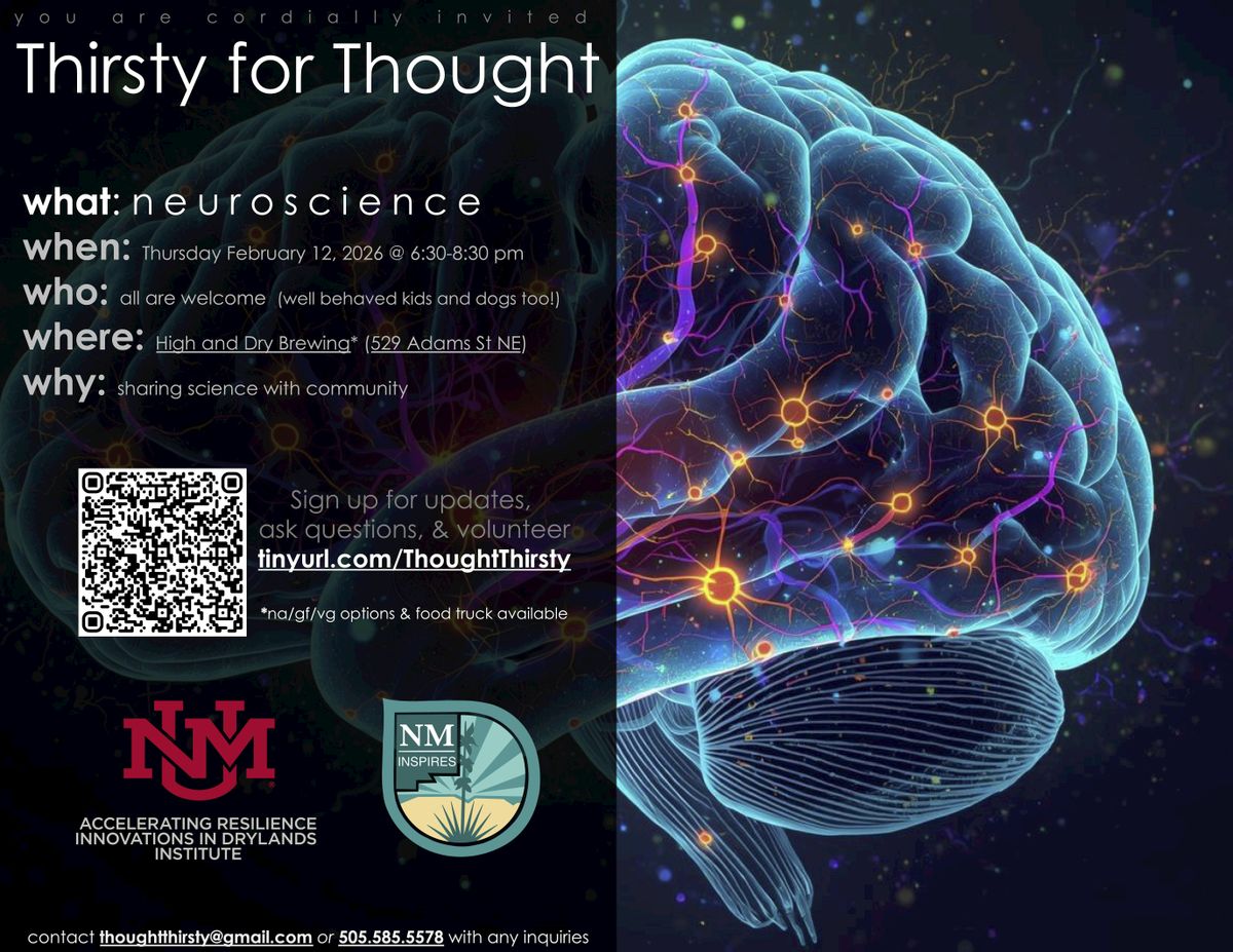 Thirsty for Thought (T4T) is back with another episode- this time we’re bringing you top experts from the field of neuroscience. Join us on Thursday, February 12, 2026 from 6:30-8:30 pm at High and Dry Brewing (529 Adams St NE). All are welcome (including well behaved kids/pets), plus na/gf bev options and a food truck will be available.
