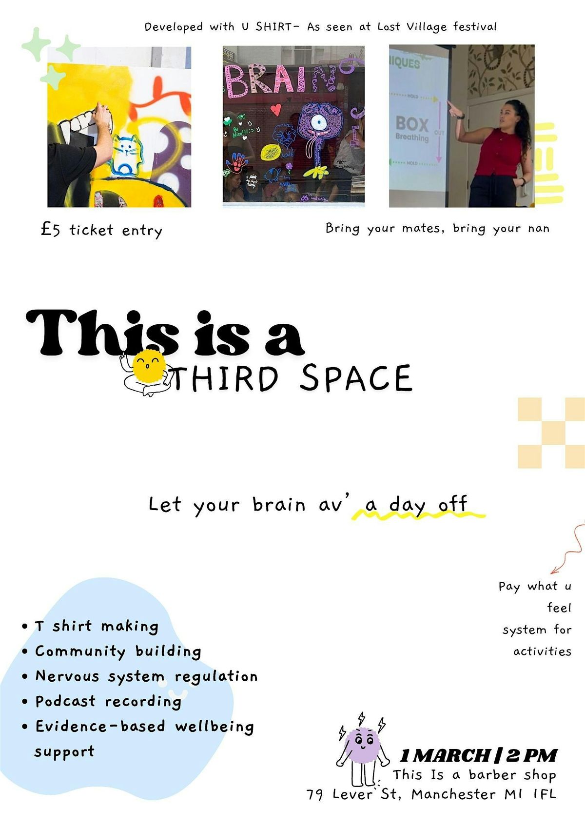 Space to paint, create, record a podcast, support your nervous sis (Our mental health professionals) print a T shirt (with the amazing minds behind U SHIRT), meet people, enjoy performances, learn to DJ, drink coffee, zone out, lock in and WHATEVER else your nervous sis needs.