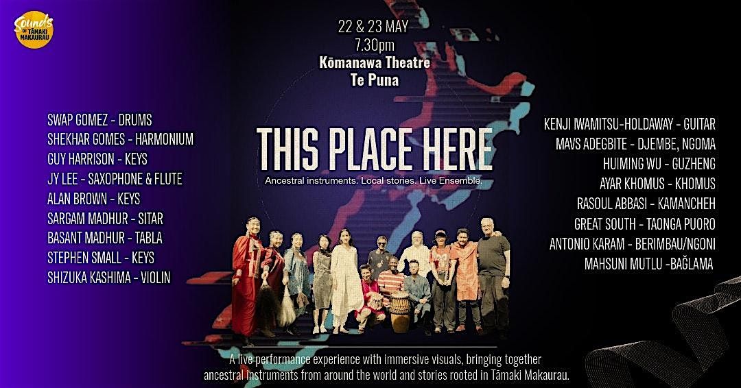 In 2026, This Place Here will be presented as an immersive live performance experience at Kōmanawa Theatre, Te Puna Creative Hub, across two free public shows on May 22 and 23. Combining live performance, immersive visuals, and documentary storytelling, this latest iteration creates a multi-sensory experience that brings together global instrumentation, image, and stories rooted in Tāmaki Makaurau.