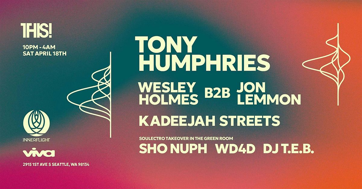 We've got a super special edition of THIS! for you on April 18th. Tony Humphries returns to Seattle for the first time in over 25 years! Wes and Jon are doing a super rare b2b set. Kadeejah Streets and Innerflight are joining us for a special collaboration for this event. And in the green Room, Seattle's beloved Soulectro takes over for the night, because vibes don't lie!