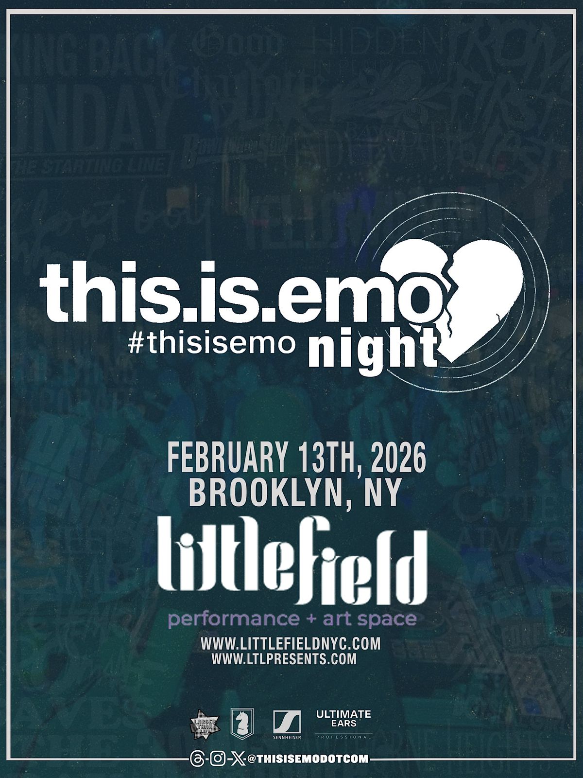 Join us on February 13th, 2026 at Littlefield for a night full of raw emotion, nostalgic tunes, and all the feels. From My Chemical Romance to Fall Out Boy, The Used to Taking Back Sunday, we’re bringing you a playlist that’ll transport you straight back to the early 2000s.