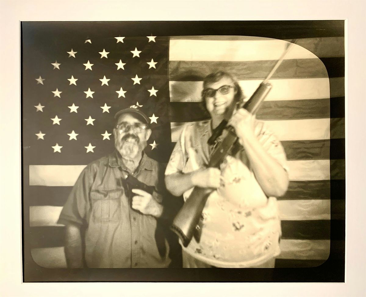 Thoughts and Prayers dives deep into American gun culture as one perpetrated by supremacy and hate, deepened by fear and identity politics. Millions of guns are bought and sold today, with estimates around one and a half guns per citizen, with many states having cash and carry laws that do not include documenting purchasers or background checks. The pervasion of gun culture evolved quickly to be one of in-group markers for extremists and supremacy groups. By both presentation and sheer volume, guns are not means of protection of communities or individuals but protection of American exceptionalism, capitalism, and institutional racism. In this exhibition, thirteen real guns are presented in the same emblematic fashion, but welded shut to be inoperable. Each photograph is blown up and printed across a grid of varied toned photographic paper, to which each subject is posed in the same fashion as the famous image of Patty Hearst standing in front of the Symbionese Liberation Army flag with a firearm. Bible verses, poetry and other historic commentary is scribed between the stripes of the American flag, being the literal subtext that supports the ideology that supports gun culture.