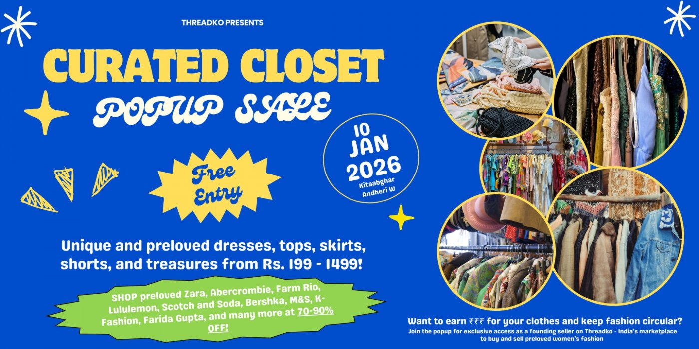Love fashion and keeping it circular? Join us in person for the Threadko Curated Closet Popup Sale. This is your chance to snag some seriously cool, handpicked pre-loved pieces - in MINT condition, with some never-worn, brand new pieces with tags. Shop pre-loved Zara, Abercrombie, Farm Rio, Lululemon, Scotch and Soda, Bershka, M&S, K-Fashion, Farida Gupta, and many more at 70-90% OFF! Prices between Rs. 199 - Rs. 1499, can't get crazier deals!