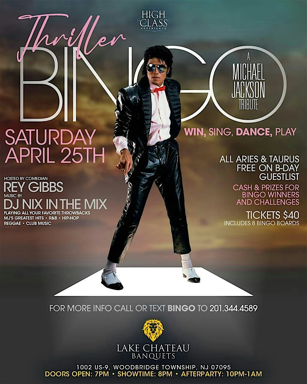 The DJ Nix in the Mix plays nothing but classic Hip Hop, R&B and MJ's greatest hits. If the song is on your board, you mark it. Hit bingo and you win real cash. Add in crowd games, callouts, singing, dancing, and Rey Gibbs on the mic, and the entire room becomes the show.