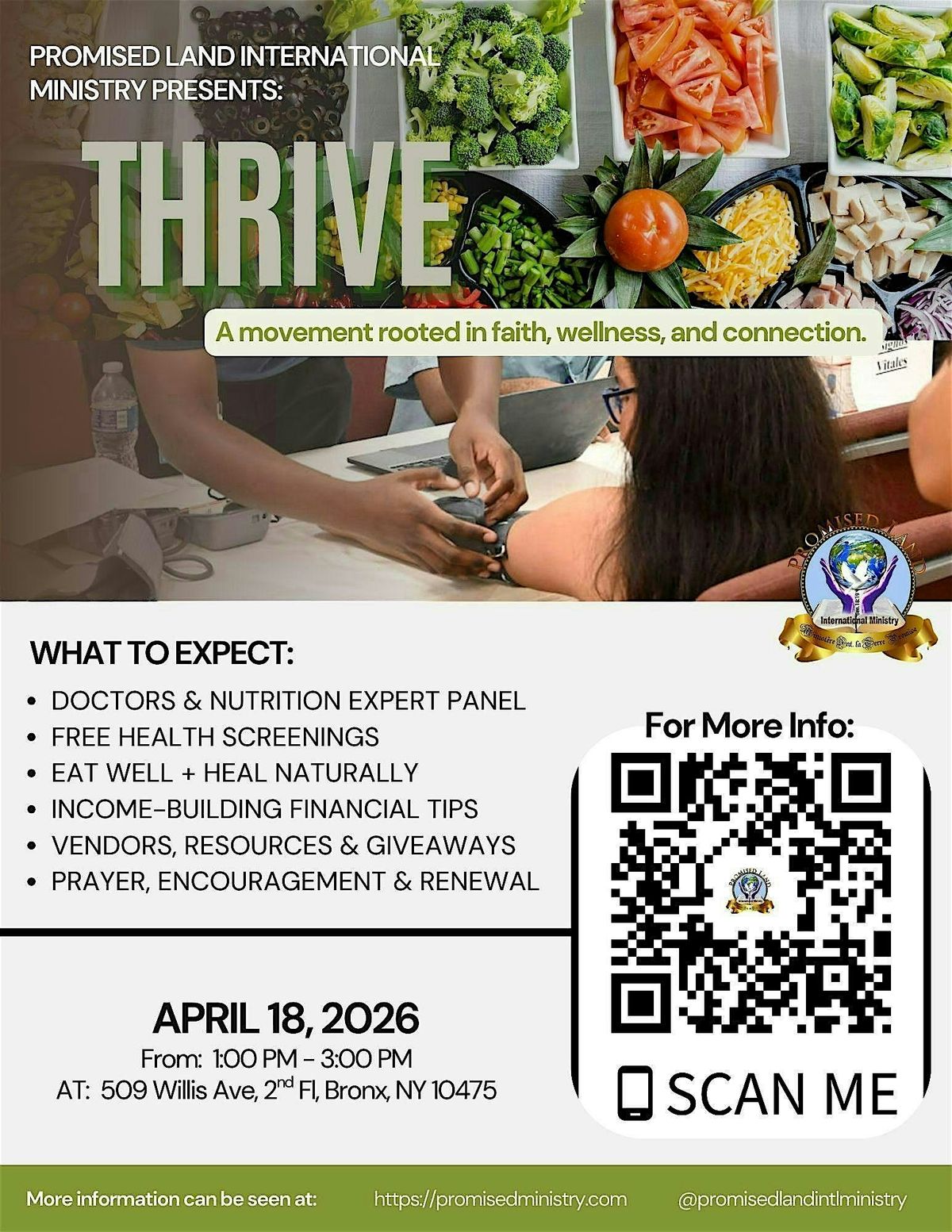 Thrive is a one-of-a-kind event where you can discover new ways to grow and flourish in your personal and professional life. Join us at Promised Land International Ministry for a day filled with inspiring speakers, interactive workshops, and networking opportunities. Whether you're looking to boost your career or enhance your well-being, this event has something for everyone. Don't miss out on this chance to THRIVE!