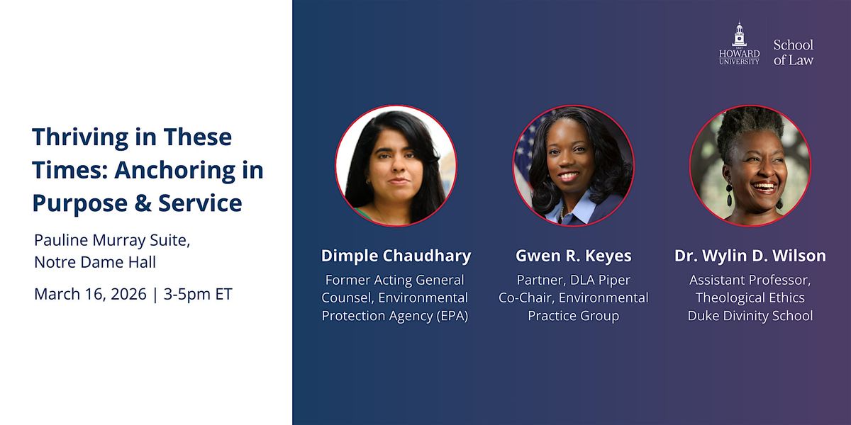 The Howard University School of Law welcomes students, faculty, and staff to Thriving In These Times, a development series focused on building leadership & resilience skills in an era of uncertainty. Experts working across disciplines to improve the lives of people will draw on their personal and professional journeys to offer practical insights and honest conversations on how to continue making progress and thrive in the moment.
