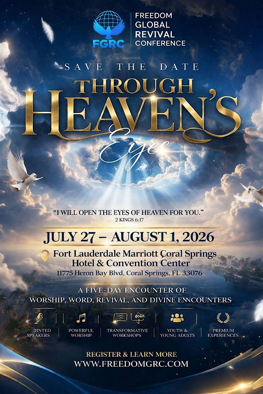 Freedom Global Revival Conference 2026 is a five-day faith-based gathering designed to bring people together for worship, the Word, revival, and divine encounters. Centered on the theme Through Heavenβs Eyes, this event is created to help attendees experience spiritual renewal, deeper revelation, and a fresh perspective through the presence of God.