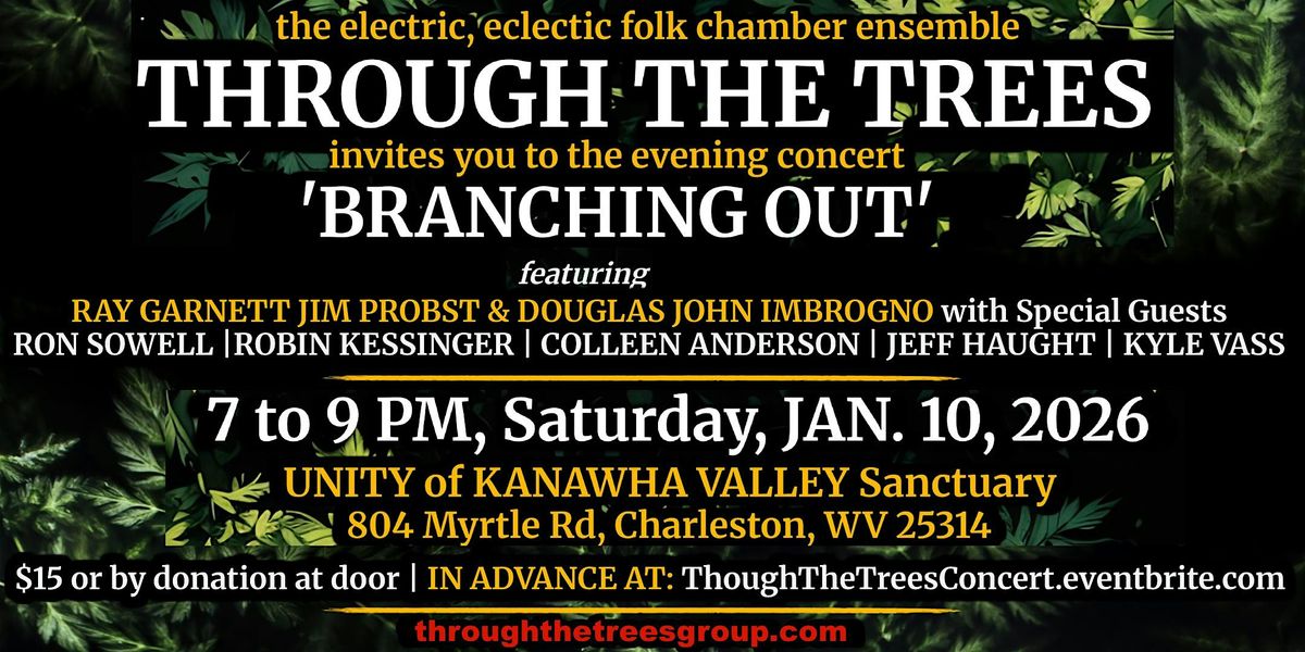 The eclectic, electric folk ensemble THROUGH THE TREES, featuring Ray Garnett on viola and violin; Jim Probst on lap dulcimer; and Douglas John Imbrogno on guitar and vocals, will be joined during their SATURDAY, JAN 10, 2026 'Branching Out' concert with guest turns by Ron Sowell, Robin Kessinger, Colleen Anderson, Jeff Haught and Kyle Vass. The concert takes place 7 to 9 p.m. in the upstairs sanctuary at UNITY of KANAWHA VALLEY, 804 Myrtle Road, in Charleston, West Virginia. The Trees perform multiple genres of music, from classic and familiar tunes from the American songbook, to contemporary and original songs and instrumentals. The group will 'branch out' throughout the evening with the addition of Ron's stylish harmonica; Robin's nationally acclaimed flatpick guitar; Colleen's sweet vocalizations; Jeff's multi-voiced keyboard; and Kyle's upright bass — plus anywhere else the Muses take us.