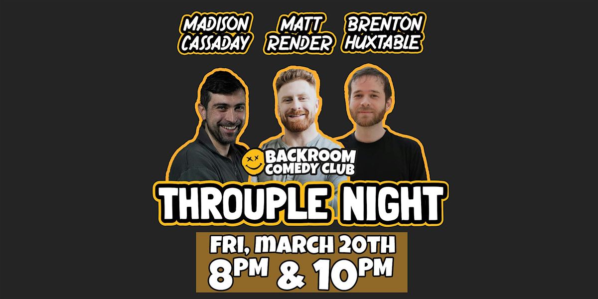 Welcome to Throuple Night at the Backroom Comedy Club! Join us on March 20, 2026 at 8PM & 10PM for a night of laughter and fun with comedians Matt Render, Madison Cassaday, and Brenton Huxtable. Get ready to have your sides splitting in this intimate venue. Don't miss out on this hilarious event!