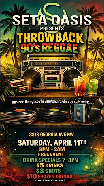 Get ready to vibe with classic beats at the Throwback 90's Reggae event! Dive into the golden era of reggae right in person, where the rhythm of the 90s comes alive. It's all about chill vibes, great music, and good times. Don’t miss out on this epic throwback – come feel the groove and soak up those nostalgic sounds!