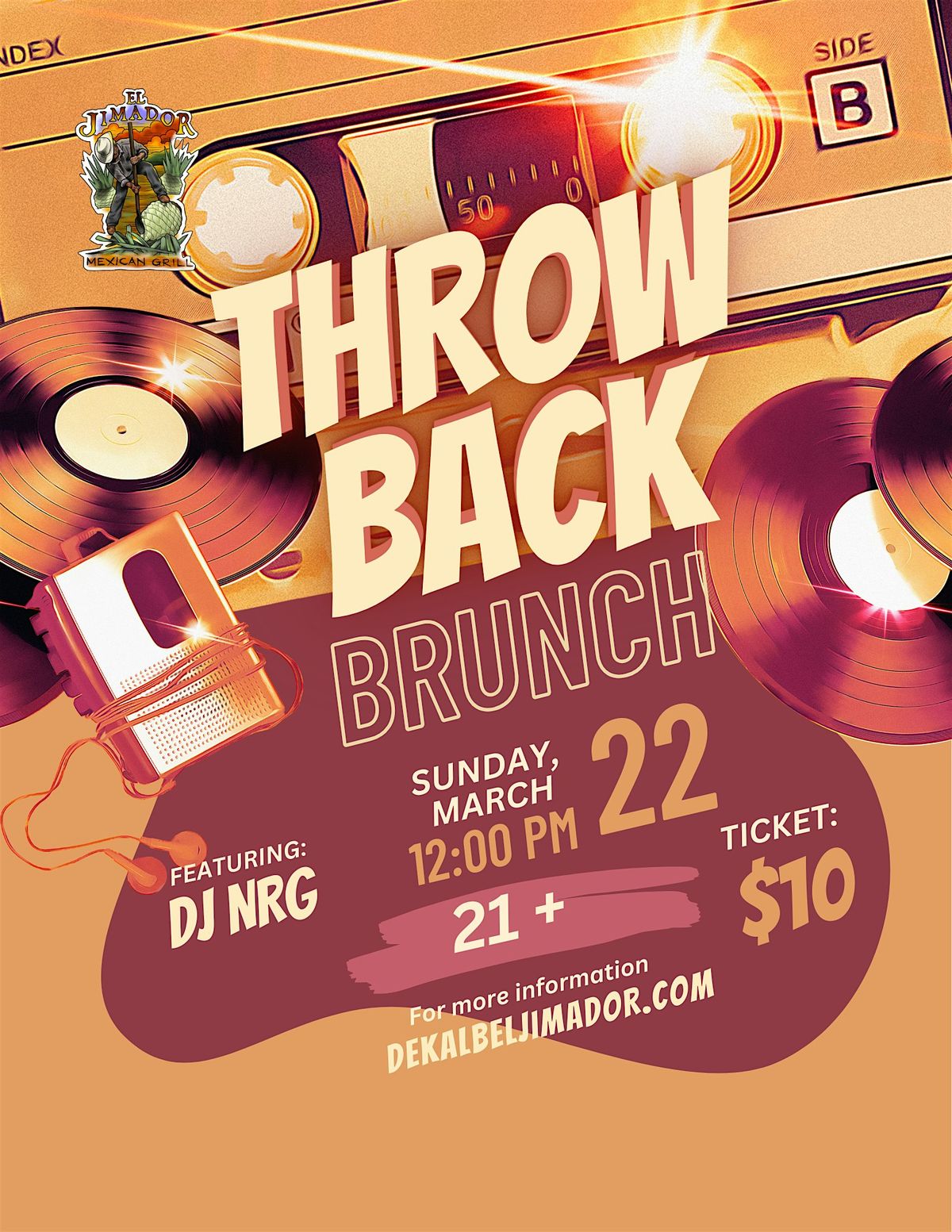 Join us for a fun and relaxed Throwback Brunch at EL JIMADOR MEXICAN GRILL! It’s happening on March 22, 2026 at 12:00 PM (Central Time). Come hungry and ready to enjoy great vibes, tasty food, and good company. Whether you're catching up with friends or just want to kick back, this is the spot to be. Don’t miss out on a chill afternoon filled with awesome flavors and throwback tunes!