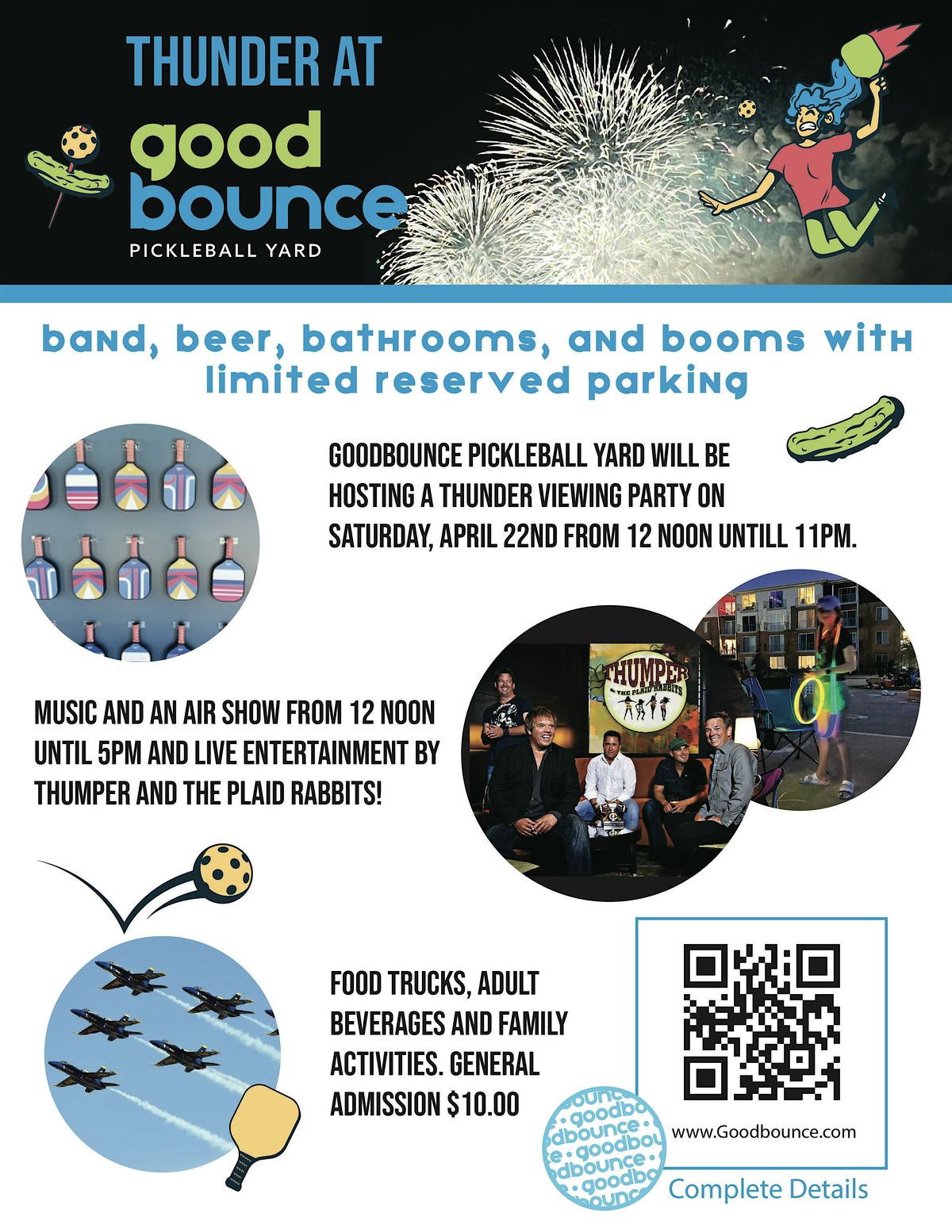 Goodbounce Pickleball Yard is proud to host our 5th Annual Thunder Viewing Party on Saturday, April 18, from 3:00 PM to 11:00 PM.