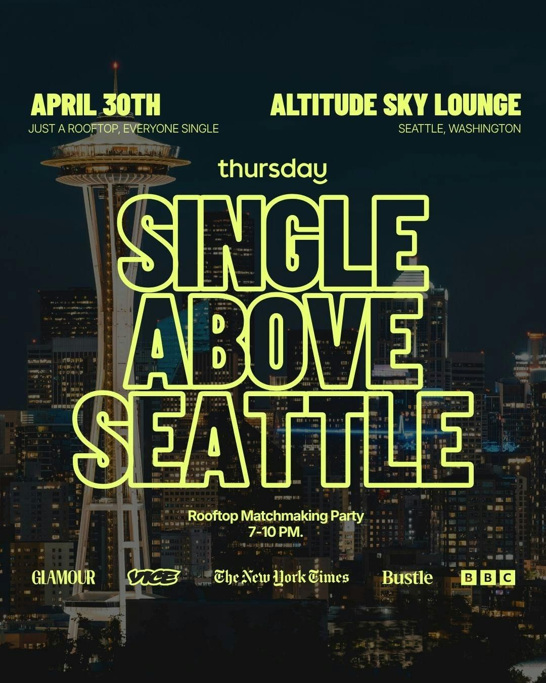Ages 25–39 Matchmaking Rooftop PartyThursday Seattle is teaming up with Matchbox for a rooftop matchmaking night at Altitude Sky Lounge. Skyline views. Great drinks. A room full of singles who actually came to meet someone.